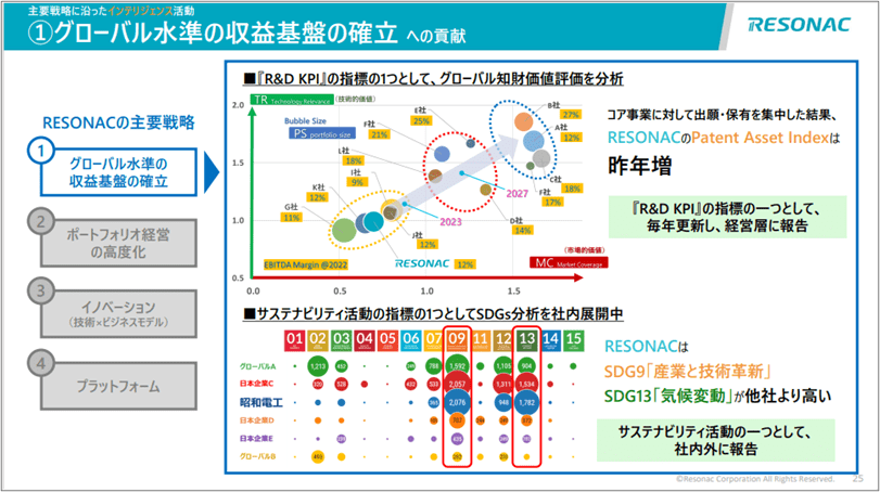 「グローバル水準基盤の確立」への貢献では、統合のR&D KPIの一つとしてPatentSightのグローバル価値評価を採用しています。縦軸にTechnology Relevance、横軸にMarket Coverageを設定したマップ上で、ベンチマーク企業と比較し図の右上を目指しています。グローバルかつROIの高い優良企業は全て右上に配置されていることが信憑性を高めています。