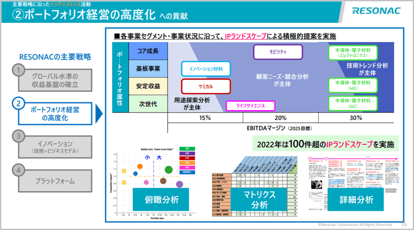 「ポートフォリオ経営の高度化」への貢献では、各事業セグメントや事業状況に沿ったIPLを積極的に活用しています。例えば、コア成長領域では技術トレンド分析、安定収益領域では既存技術の用途探索分析等、種々異なるニーズに合わせ、昨年は100件以上のIPL案件を実施しました。