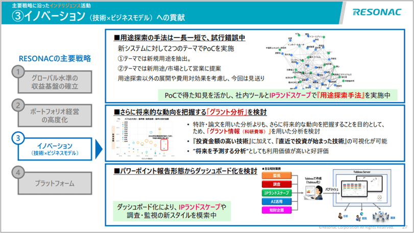 「イノベーション(技術×ビジネスモデル)」への貢献では様々な手法を逐次模索しています。用途探索のツールや手法や、将来動向を予測するグラント分析等を検討しています。