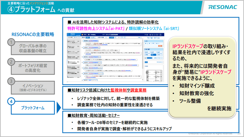 「プラットフォーム」への貢献では、知財関連ツールの整備や知財教育の強化に力を入れています。特許可読性向上システム「ai-PAT」、類似順ソートシステム「ai-SRT」開発等のAI活用の他、監視・調査やセミナー等の活動により、全社に渡る知財マインドを醸成していき、その結果、特許情報に明るい社内風土の構築を目指しています。