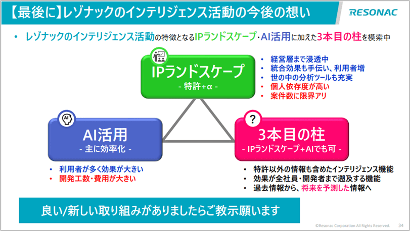 最後に、現在のレゾナックのインテリジェンス活動はIPL、AI活用共に良い方向に進んでいると思います。しかしながら、両活動は始めて既に5年ほど経ち、そろそろさらに3本目の新しい柱の必要も感じています。IPLは非常に良いツールだと思うが、「個人依存度が高い」「一部の方のみへの提供で広げられる規模が大きくない」といった課題もあり、もっと会社全体へ広げていきたい想いがあります。AI活動についても今は効率化の部分のみで、その後は模索中の状況です。