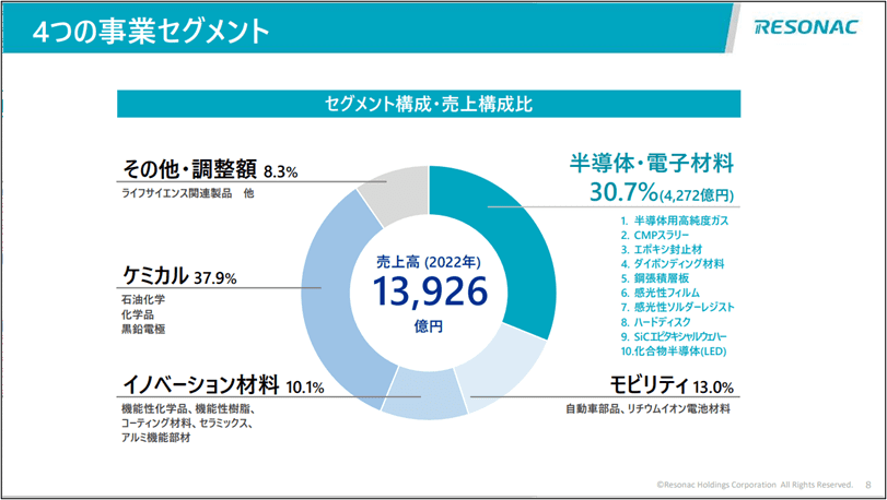 事業は大きく4つのセグメントにより構成されます。「半導体・電子材料」では、半導体製造プロセスの前工程から後工程まで幅広い材料を提供しています。電子材料は昭和電工時代からのハードディスクメディアを有しています。「モビリティ」では、樹脂製バックドアモジュール、リチウムイオン電池の負極材などに加え、CASE化に伴う軽量化や電動化にも取り組んでいます。「ケミカル製品」では石油化学、化学品、黒鉛電極が代表的な製品ですが、カーボンニュートラル対応が中心となりつつあり、積極的な技術開発を行っています。「イノベーション材料」では機能性化学品、機能性樹脂、コーティング材料など、事業のイノベーションや競争力強化を支え、技術プラットフォームとなる素材開発に取り組んでいます。