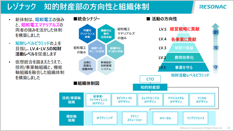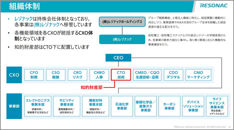 今回の統合に際し、レゾナックは持株会社制へ移行しました。「株式会社レゾナックホールディングス」が持株会社となり、「株式会社レゾナック」を傘下として各事業が移管される形となりました。また経営監督機能はCXOが統括する体制となりました。知的財産部は研究所や研究開発の部署と共にCTO(Chief Technology Officer)直下に配置されています。