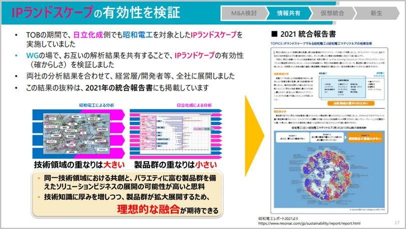 インテリジェンスのワーキンググループでは、IPLの有効性を検証しました。統合確定後、日立化成側でも昭和電工を対象としたIPLを実施していたため、両社が実施したIPLの結果が正しいか、答え合わせができる良い機会となりました。お互いの事業状況が、IPLの結果でも正しく反映していることが証明され、社内に報告したことで、さらにIPLの信頼性・有用性が社内に浸透しました。昭和電工側の分析では、「両社は技術の重なりが多く、シナジー効果が高い。」という結果を示し、日立化成側の分析では、「製品群の重なりが少ない。」という結果を示しました。二つの結果を合わせて、「技術の重なりは多いが、製品は分散する」、つまり「同じ技術で製品展開は広がる理想的な融合」という結論を示し、報告すると「理想的なシナジー発揮の将来像を表している」と高く評価され、統合をアピールするその年の統合報告書にも掲載されました。