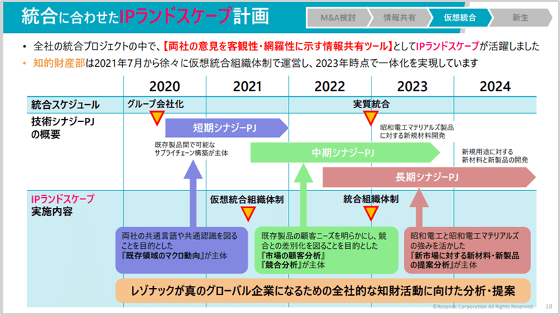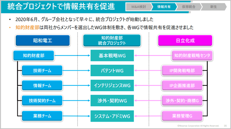 昭和電工が日立化成の公開買付を発表したのが2019年12月ですが、その少し前から約3年間の中での知的財産部の活動を「M&A検討」「情報共有」「仮想統合」「新生」の4フェーズに分けて説明します。